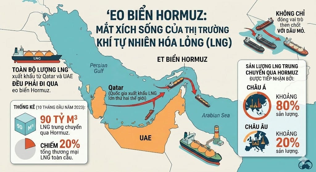 Hormuz: 20% lượng LNG thế giới đi qua eo biển — Phần lớn đến từ Qatar và hiện không có nguồn thay thế tương đương nếu bị gián đoạn.