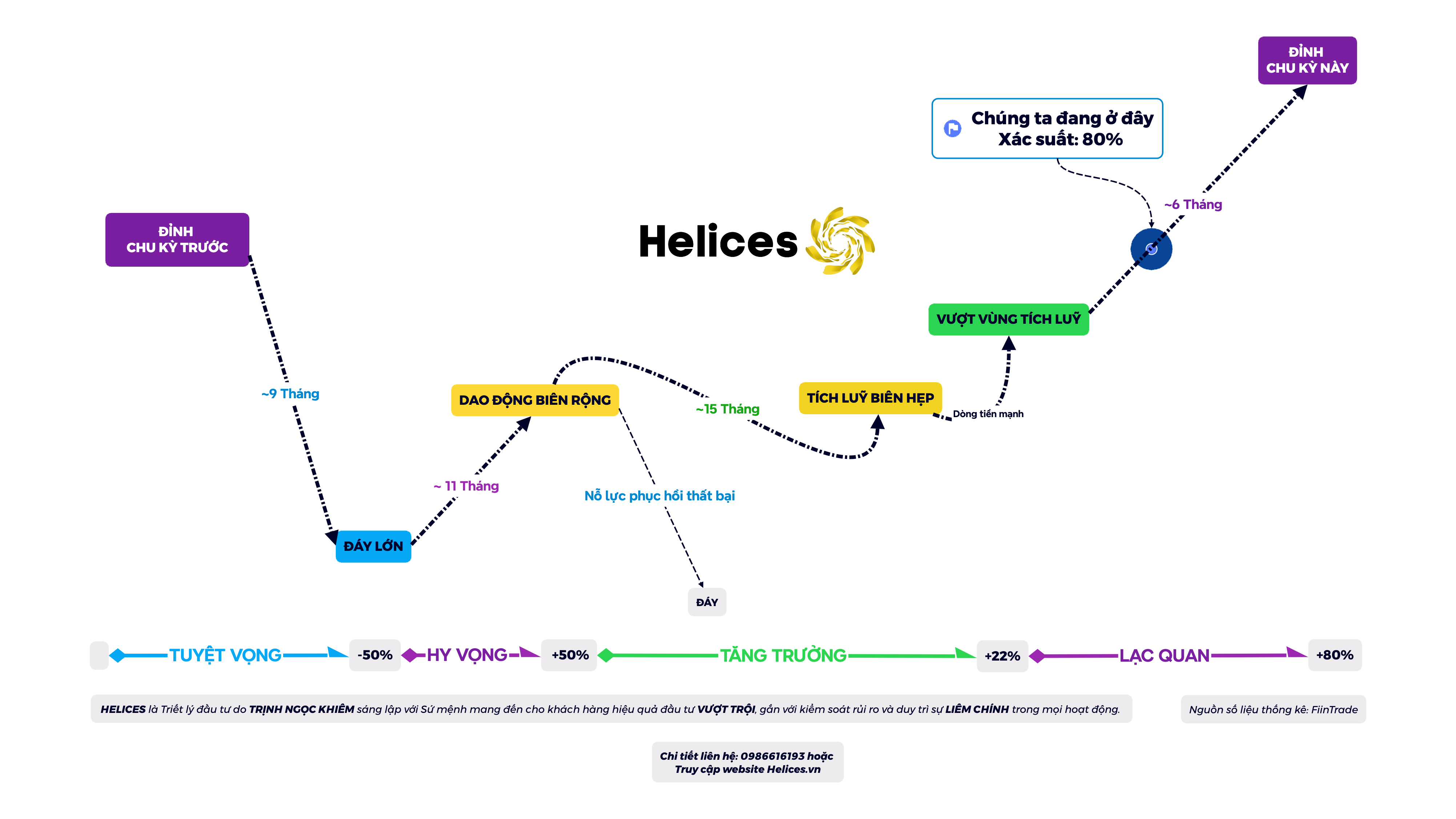 Với vô vàn thất bại và chiêm nghiệm, triết lý Helices được hình thành, và với các dữ kiện hiện tại, chúng tôi cho rằng, với xác suất 80%, chúng ta đang ở giai đoạn LẠC QUAN - giai đoạn cuối cùng trước khi chu kỳ tăng trưởng kết thúc.