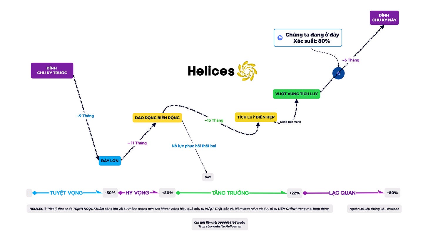 Theo Helices, với xác suất 80%, chúng ta đang ở giai đoạn lạc quan - giai đoạn mà biên độ biến động mạnh, cảm xúc thất thường, và cơ hội lẫn lộn với bẫy.